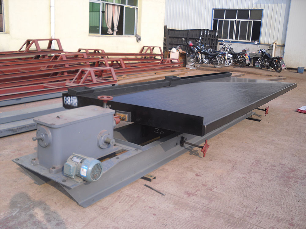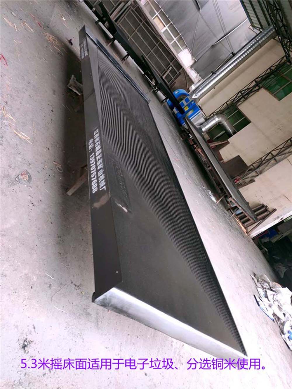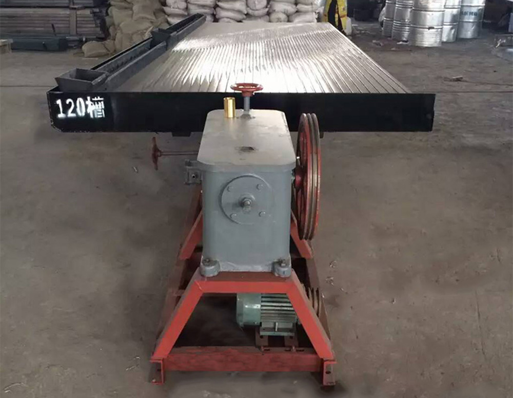 床面外形呈直角梯形,在木制框架內(nèi),木板沿斜向(與軸線交角45度)拼成平面。搖床面分漆灰刻槽床面及橡膠床面兩種。漆灰刻槽床面用于選別細泥,橡膠床面則用于選別粗礦。用于選取細泥的搖床面沿縱向有0.5度左右的向下傾斜,用于選別粗砂的搖床則在縱向有1-2度的傾斜,在精礦端抬高?v向坡度的大小借支撐機構(gòu)上的螺栓調(diào)節(jié)。