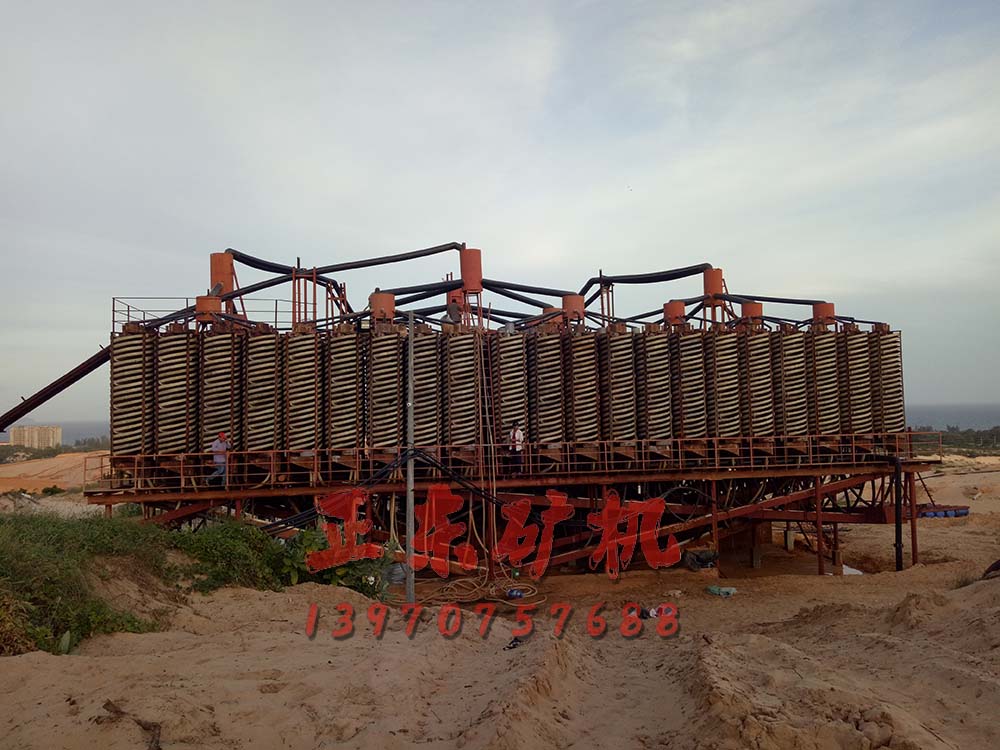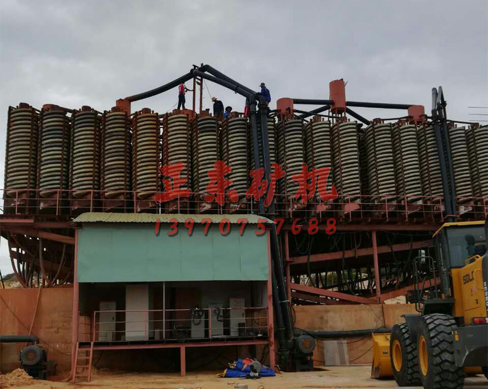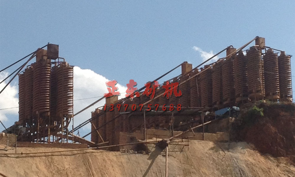 將螺旋溜槽立起,校準(zhǔn)垂直線,用鐵架或木頭固定在合適的位置,由砂泵將礦砂送到螺旋上頂兩個(gè)進(jìn)料口處,加入補(bǔ)充水,調(diào)節(jié)礦槳濃度,礦槳自然從高往下旋流,在旋轉(zhuǎn)的斜面流速中產(chǎn)生一種慣性的離心力,以礦砂的比重、粒度、形狀上的差異,通過旋流的重力和離心力的作用,將礦與砂分開,精礦流入精礦斗用管道接出,尾砂流進(jìn)尾砂斗用管道接到砂池,再用砂泵排走,完成了選礦的全過程。