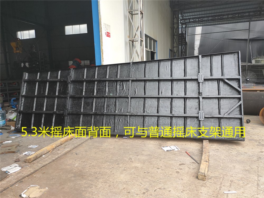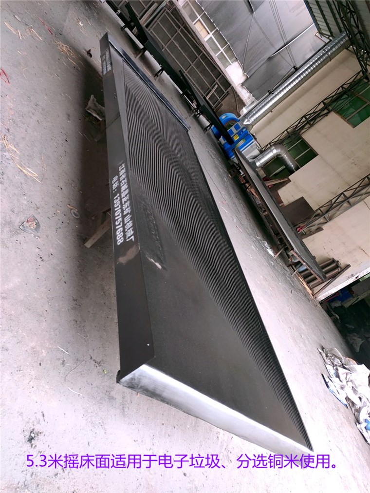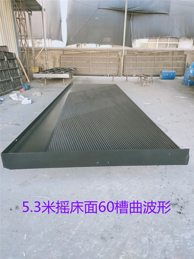 床面外形呈直角梯形,在木制框架內,木板沿斜向(與軸線交角45度)拼成平面。搖床面分漆灰刻槽床面及橡膠床面兩種。漆灰刻槽床面用于選別細泥,橡膠床面則用于選別粗礦。用于選取細泥的搖床面沿縱向有0.5度左右的向下傾斜,用于選別粗砂的搖床則在縱向有1-2度的傾斜,在精礦端抬高?v向坡度的大小借支撐機構上的螺栓調節(jié)。