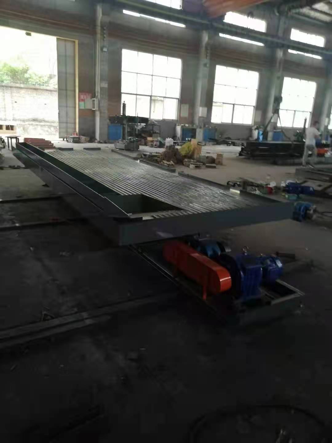 鐵質(zhì)搖床是在原玻璃鋼搖床面上加以改進的一種新型重力選礦設(shè)備,主要針對鹽底料,鋼渣、焚燒垃圾等大顆;蚱瑺钗锪,能有效分選出紙屑、塑料片、金屬片。其工作原理與6S搖床類似,也是通過床面往復(fù)運動產(chǎn)生離心力將床面上的物料進行比重差分級。